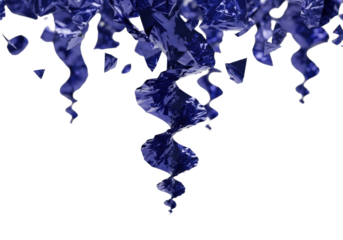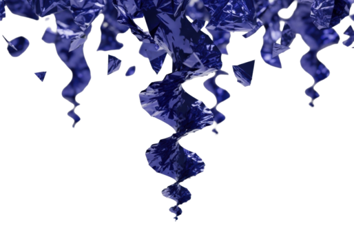 Dynamic scattering of deep indigo blue, reflective, crinkled metallic foil shards spiraling on a transparent studio background, a digital data dispersal concept