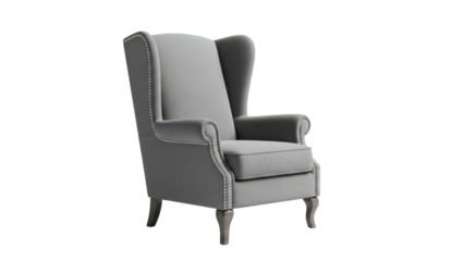 Elegant wingback chair in grey fabric with nailhead trim details isolated on white background