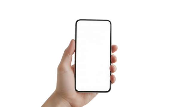 Smartphone mockup with empty display held by hand in sleek laundry room Isolated on Transparent Background