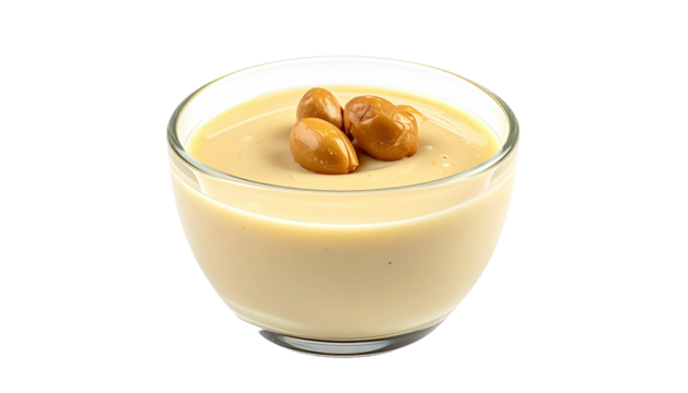 Small glass bowl filled with beige pudding topped with nuts