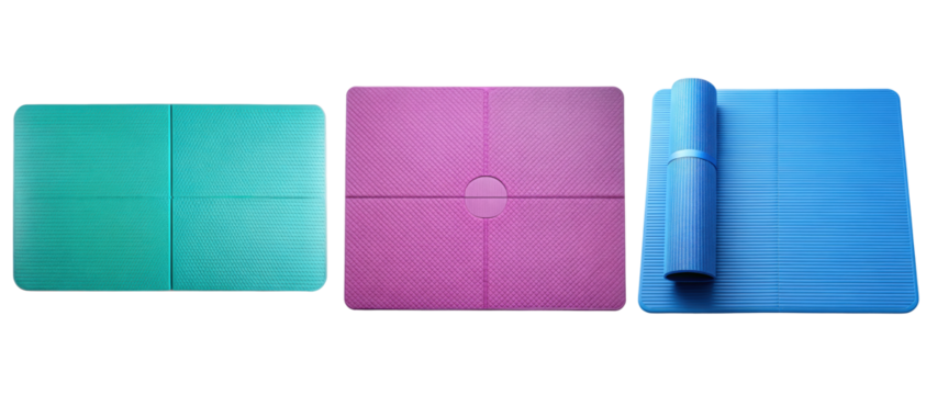 Three exercise mats in different colors on a transparent background