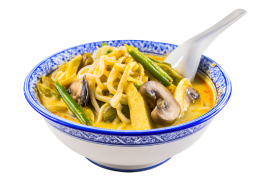 Delicious Thai curry noodle soup in a traditional ceramic bowl isolated on transparent background.