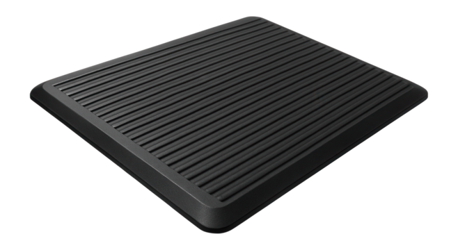 Industrial-style cushioned floor mat with a ribbed surface for a workshop area