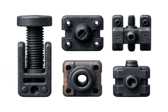 Illustration of set of industrial metal hardware pieces isolated on transparent background for assembly