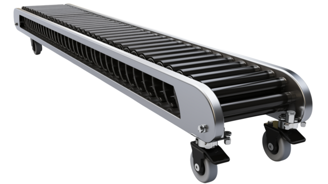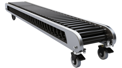 Roller conveyor system isolated on transparent background, an industrial machine used for automation and transport in manufacturing and logistics