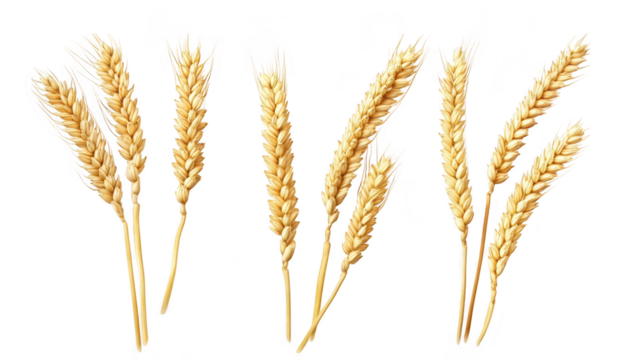 A collection of golden wheat stalks arranged artistically against a white background. symbolizing agriculture and harvest. ideal for use in food-related or farming themes