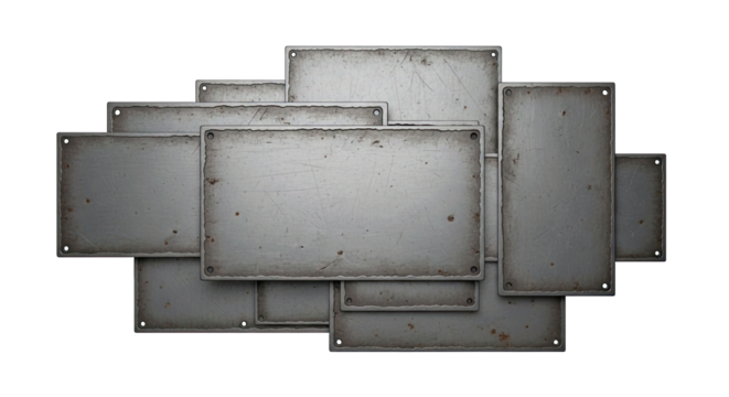 Industrial Grunge Plates: A close-up showcases a collection of aged, textured metal plates, their surfaces bearing the marks of time. This image evokes feelings of industrial history and strength.