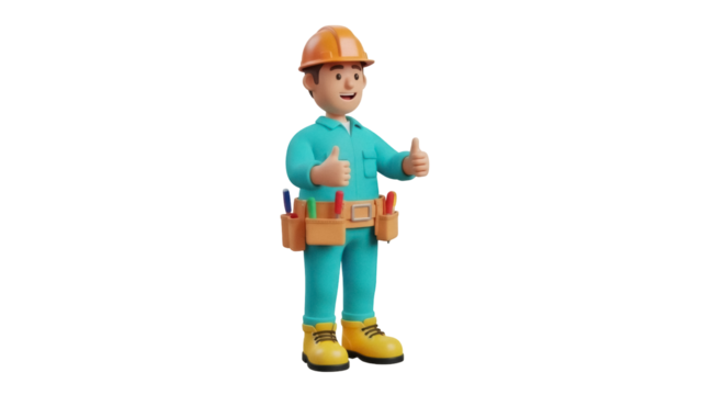 Isolated construction worker cartoon shows thumbs up, repair and build industry concept render