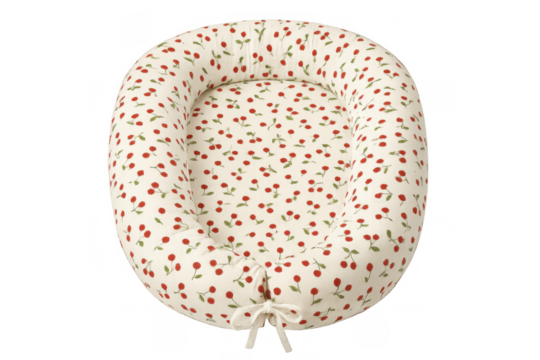 Baby nest or newborn lounger with cherry print, providing a cozy portable bed for infant sleep on transparent background