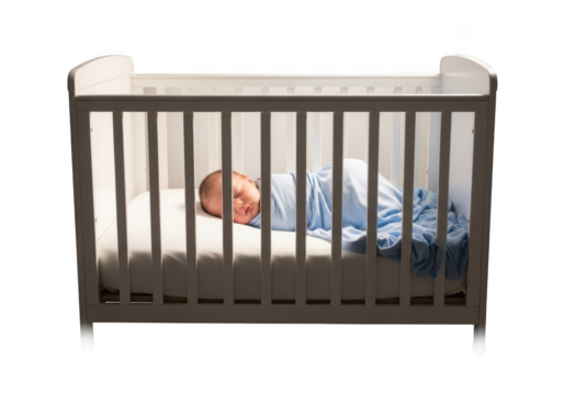 Peaceful baby sleeping soundly in a wooden crib isolated on transparent background