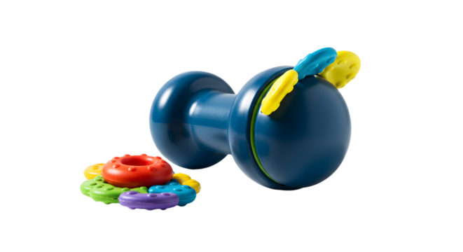 BABY TOYS - Colorful baby pacifier with multiple ring teething toys, infant soothing accessory on white background, perfect for newborn care