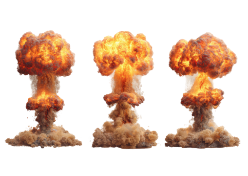 Fiery explosion creating a large mushroom cloud of dark smoke and intense flames, with debris and dust scattering from the powerful ground detonation on a transparent background, png