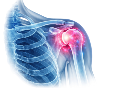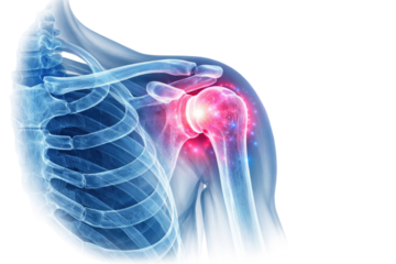 A person experiencing shoulder pain, with a detailed illustration of the affected area. The red highlights the source of discomfort, isolated on transparent background