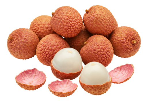 Lychee fruit close up red skin white flesh transparent background food photography