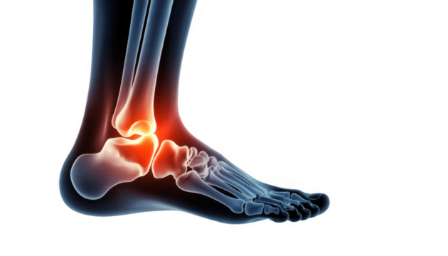 Human knee joint x-ray with red pain area indicating inflammation or injury concept for orthopedic surgery arthritis and sports medicine healthcare visualization isolated on a white surface