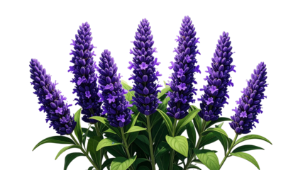 Six purple lavender flower spikes with green leaves arrangement illustration on transparent and white background