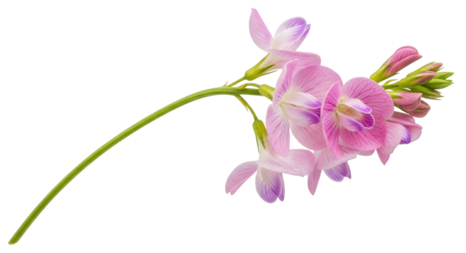 Isolated common sainfoin flowers on stem, pale violet petals, summer wildflowers, inflorescence