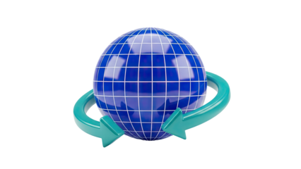 Blue globe with arrows symbolizing global data transfer on transparent background