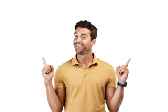 Happy man, portrait or pointing up to a sale, retail product offer or discount deal isolated on png background. Transparent, smile or male person showing results, news info or menu choice promotion