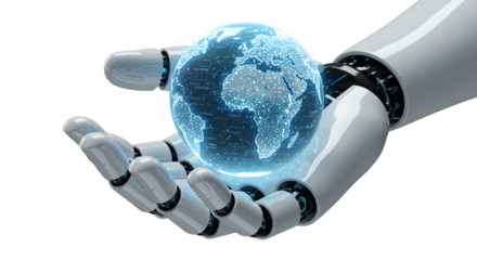 Macro-focused depiction of futuristic male robot hand supporting a radiant digital globe with cyber overlays, electric blue and silver tones, isolated on transparent background, png