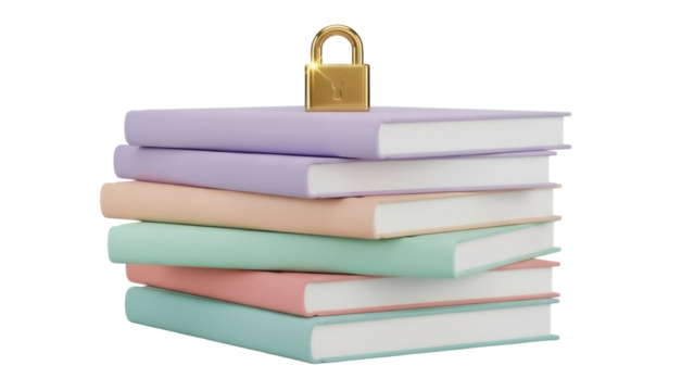 Stack of pastel books with golden padlock isolated PNG, colorful books pile for education and security concepts on transparent background