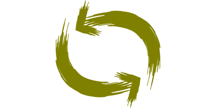 Two olive green brushstroke arrows forming a circular refresh or reload symbol on a white background, representing a continuous cycle or update.