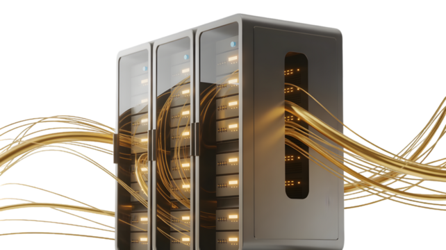 Server Racks with Golden Data Streams, Illuminated Technology, Dark Background, Cinematic Style