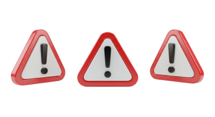 Series of three prominent 3D rendered red and white warning signs on a clean white field