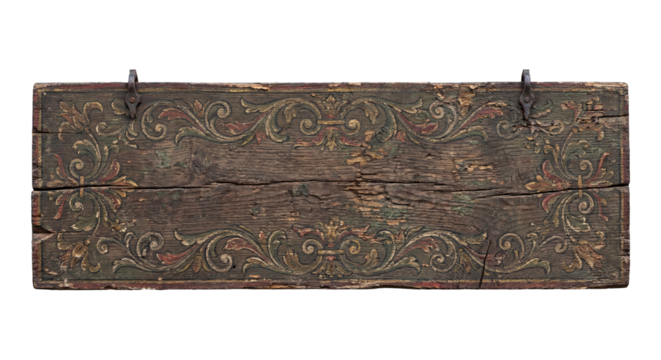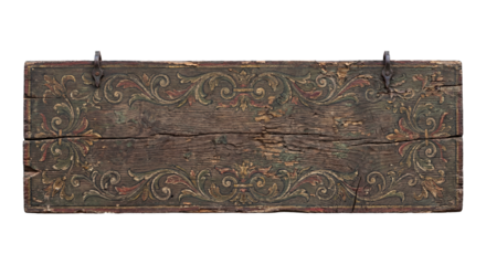 Ornate, aged wooden sign with carved floral details. The weathered texture and vintage design offer a rustic, elegant touch for decorative or informational use.