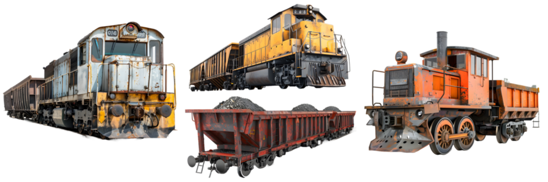 Model of diesel-electric and steam locomotives with hopper cars isolated on a white background, png