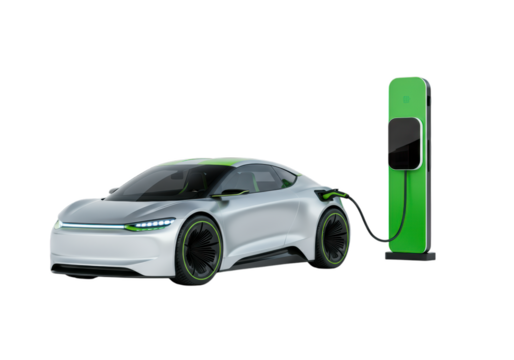 Futuristic electric car charging at a vibrant green station ready for sustainable driving