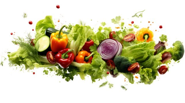 Many very fresh raw vegetables are falling together. Delicious and healthy ingredients for salad and cooking. transparent background
