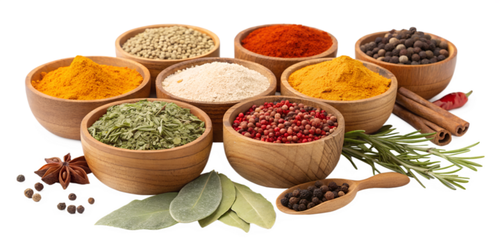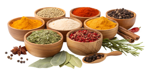 Spices and herbs in bowls with red chili, paprika, and cinnamon on a white background