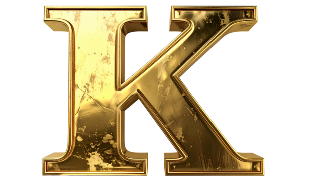 A close-up view of a metallic, golden letter "K", showing surface texture and slight imperfections. The bold shape appears three-dimensional