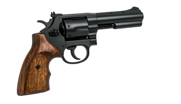 A black, metallic revolver with wooden grips sits angled, isolated on a solid black background