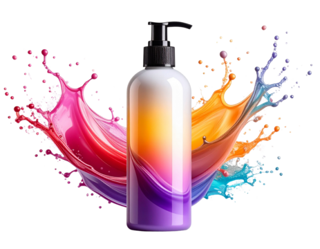 Vibrant Liquid Splash Surrounding a Cosmetic Bottle.