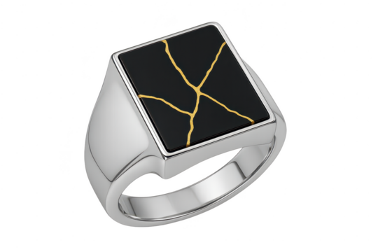 Silver ring with black stone inlaid with gold on transparent background view