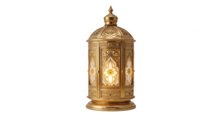 Ornate intricately detailed antique golden brass lantern featuring glowing white panel inlays and rich arabesque carvings on transparent background