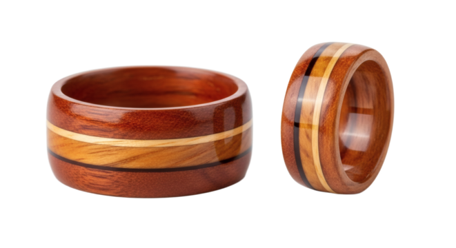 Two wooden rings with inlay stripes, handmade jewelry on transparent background