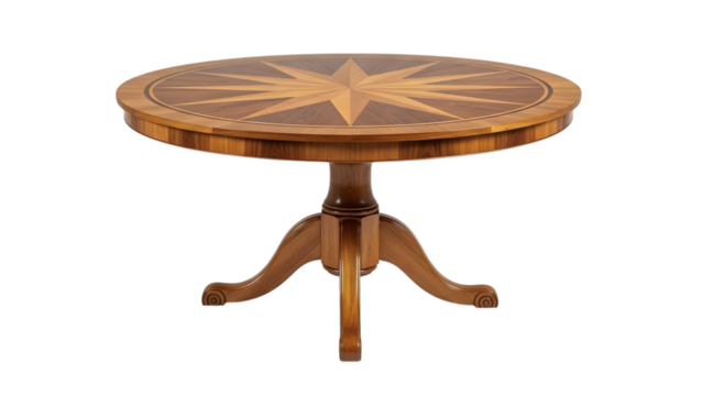Wooden round table with star pattern inlay and tripod base isolated on a transparent background wooden table