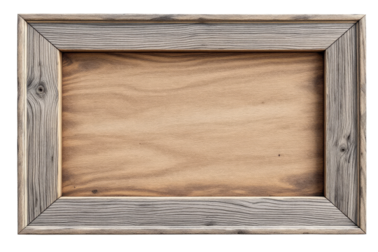 Rustic wooden picture frame with weathered gray wood and warm brown inner panel isolated on white background