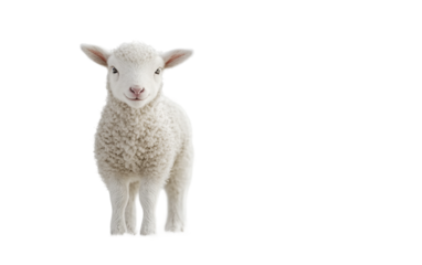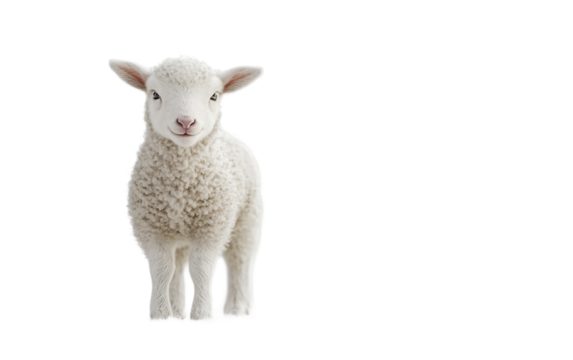 Fluffy baby lamb standing peacefully on soft white ground with a gentle and innocent expression isolated on transparent background PNG