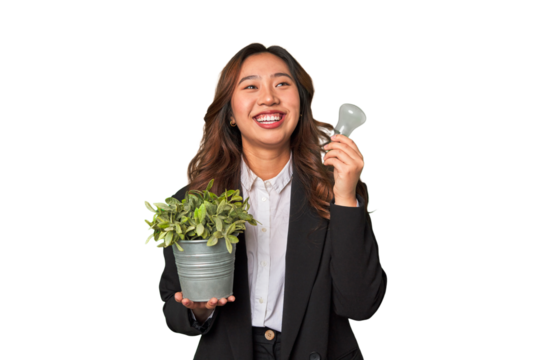 A young Chinese businesswoman holds a lightbulb and plant, embodying her innovative ideas and commitment to sustainability and the environment.