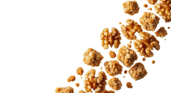 Nutty Granola Clusters and Caramelized Walnuts Cascade on a Clean White Canvas inviting healthy eating concepts and innovative snack ideas with