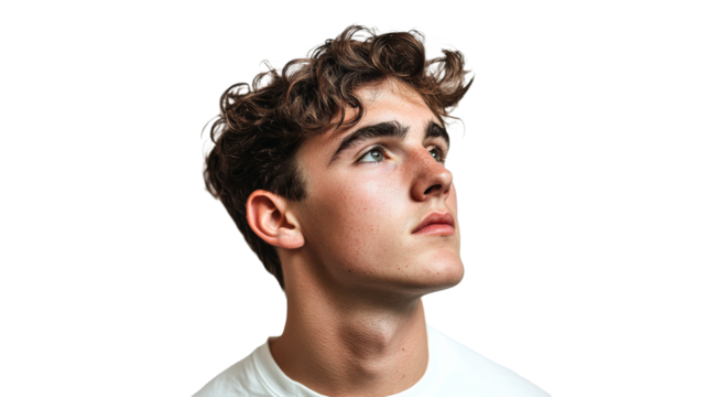 Contemplative Man in Thought: A man deep in thought, gazing upwards with a thoughtful expression, his hand gently touching his chin, personifying intellectual curiosity and reflection.