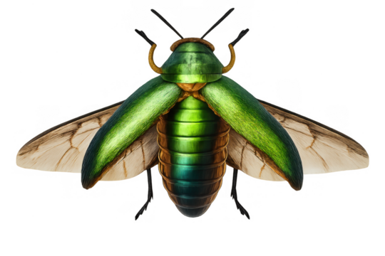 Green iridescent beetle with open wings, an intricate insect illustration on a transparent background