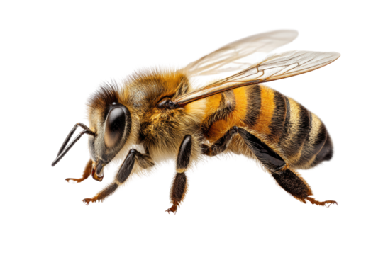 A bee is standing on a white background. The bee is yellow and black striped, png