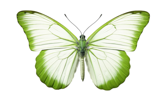 A vibrant green and white butterfly gracefully flutters against a pristine white background