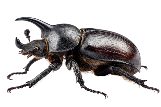 Rhinoceros beetle portrait showcasing its exoskeleton details revealing natural armor and anatomical structure of a large insect emphasizing the texture and design intricacy of