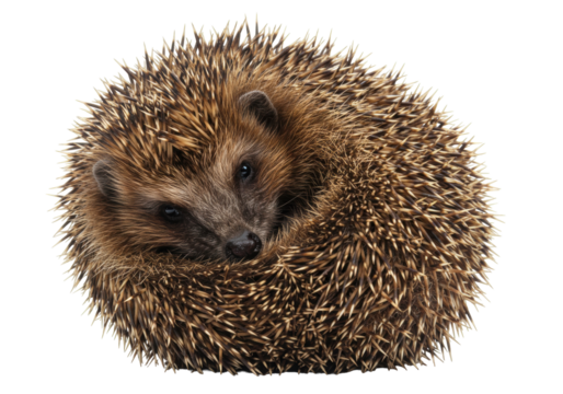 Isolated curled up hedgehog, close-up portrait of cute wild spiny mammal, adorable animal